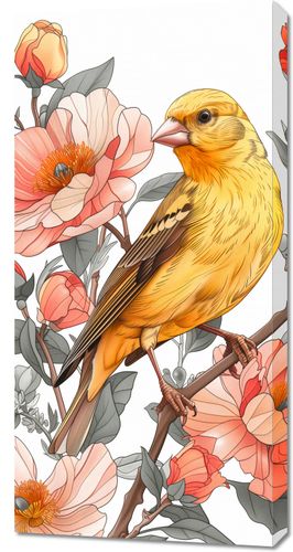 Obraz z serii natura zatytułowany Wiosenny Śpiewaczek przedstawia pełną detali i życia scenę, w której jaskrawo żółty ptak, przypominający kanarka, spoczywa na gałęzi wśród kwitnących kwiatów. Delikatne i subtelne kolory kwiatów w pastelowych odcieniach różu i pomarańczu tworzą miękki kontrast do żywego upierzenia ptaka. Precyzyjne linie i staranne cieniowanie nadają ilustracji realistycznego wyglądu, a roślinność w tle jest równie szczegółowo wykonana, co dodaje kompozycji głębi i bogactwa. Ten obraz to celebracja wiosennego odrodzenia i piękna natury, idealny do ożywienia każdego wnętrza, szczególnie pokoju dziennego, przestrzeni odpoczynkowej lub kawiarni o przytulnej atmosferze.