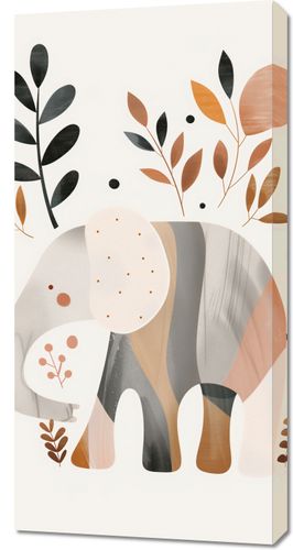 Obraz z serii wnętrza zatytułowany Wypocznij Mały przedstawia stylizowaną ilustrację słonia, wplecionego w delikatną kompozycję z abstrakcyjnymi elementami roślinnymi. Słoń jest przedstawiony w spokojnej, stonowanej palecie kolorów z akcentami ciepłych brązów, beżów i delikatnych szarości, co nadaje ilustracji elegancki i nowoczesny charakter. Proste, ale efektowne formy roślinne wokół słonia dodają plakatowi lekkości i harmonii, a dyskretne kropki i linie na ciele słonia tworzą wrażenie tekstury. Całość tworzy obraz spokoju i łagodności, idealny do wnętrz, w których chce się wprowadzić elementy natury i uspokajającej estetyki, takich jak salony, pokoje relaksacyjne lub przestrzenie dla dzieci.