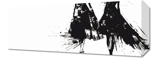 Obraz z serii wnętrza zatytułowany Atramentowy Przerys. Plakat ukazuje dwie stylizowane postacie kobiet w dynamicznej pozie, co nadaje wrażenie ruchu i elegancji. Obraz jest utrzymany w monochromatycznej palety kolorystycznej, gdzie silne kontrasty czerni i bieli tworzą dramatyczny efekt. Postaci są zredukowane do esencjonalnych form i plam atramentu, co przypomina szkice mody z charakterystycznym dla tego gatunku użyciem cienia i światła do zarysowania konturów odzieży i ciała. Energetyczne smugi i plamy atramentu sprawiają, że suknie wydają się falować i poruszać, a zarysowane w sposób abstrakcyjny obcasy dodają całej kompozycji współczesnego wyrazu. Ten obraz mógłby być wspaniałym dodatkiem do przestrzeni o nowoczesnym, artystycznym charakterze, takich jak atelier, modowe salony czy współczesne galerie.