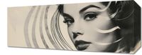 Obraz z serii pop art zatytułowany Ikonka Kina. Przedstawia czarno-białe portretowe zdjęcie klasycznej gwiazdy filmowej, której twarz jest częściowo zakryta przez geometryczny wzór spiralnych linii. Linie te dodają obrazowi dynamiki i nowoczesnego akcentu, kontrastując z retro estetyką portretu. Ten obraz łączy stare z nowym, sugerując zarówno ponadczasową piękność, jak i współczesne spojrzenie na sztukę. Idealny do eleganckich, miejskich przestrzeni lub jako dekoracja dla miłośników klasycznego kina.
