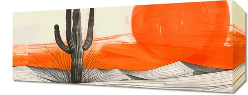 Obraz z serii abstrakcja zatytułowany Kaktus Saguaro przedstawia surrealistyczny krajobraz pustynny, w którym dominuje wielki kaktus saguaro w centrum kompozycji. Szczegóły rośliny są wyraźne i realistyczne, z kolcami i wydłużonymi ramionami, które sięgają ku niebu. Tło to abstrakcyjna interpretacja zachodu słońca, z dużym, intensywnie pomarańczowym słońcem, które zajmuje większą część górnej połowy plakatu. Niebo jest przejrzyste, z nielicznymi smugami, które dodają głębi i dynamizmu. Pustynna ziemia jest przedstawiona liniami, które falują i kręcą, tworząc wzór przypominający piasek modelowany przez wiatr. Paleta barw skupia się na odcieniach pomarańczowego, beżowego i czerni, co nadaje kompozycji ciepły i spokojny nastrój. Obraz ma wyraźnie współczesny charakter, łącząc elementy realistyczne i abstrakcyjne, co czyni go atrakcyjnym dla szerokiej gamy gustów artystycznych.