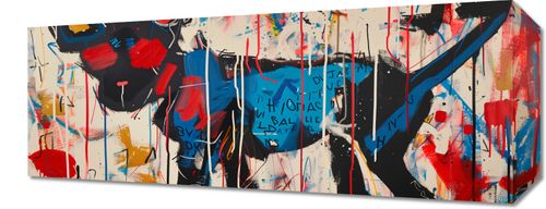 Obraz z serii abstrakcja zatytułowany Miejski Pies. Żywa kompozycja przedstawia sylwetkę psa w stylu street art w której dominują kolory takie jak czerwień, niebieski i żółty, które są rozmieszczone na płótnie w sposób dynamiczny i spontaniczny. Praca wydaje się być pełna ruchu dzięki pociągnięciom pędzlem i kroplom farby rozpryskującym się w różnych kierunkach. Na pierwszy plan wyłania się czarna sylwetka psa, której kontury są podkreślone kontrastującymi barwami i szkicowym stylem. W tle można dostrzec chaotyczne linie i formy, które mogą symbolizować miejski chaos i energię, a także fragmenty tekstu, które dodają dziełu charakteru ulicznego muralu. Całość sprawia wrażenie radosnej i pełnej energii ekspresji artystycznej. Świetnie sprawdzi się w nowoczesnych przestrzeniach miejskich.