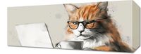Obraz z serii abstrakcja zatytułowany Nie przed Kawusią. Przedstawia uroczy obraz kota o rudym umaszczeniu, który nosi okulary i wydaje się być zaczytany w ekranie laptopa. Scena jest przedstawiona w ciepłych, nasyconych barwach, które podkreślają miękkość i puszystość futra kota. Elementy graficzne, takie jak plamy i rozpryski farby, nadają kompozycji artystycznego charakteru. Filiżanka kawy umieszczona obok laptopa dodaje codziennej atmosfery, sugerując, że może to być obrazek z domowego biura lub miejsca relaksu. Ten obraz mógłby być idealnym elementem dekoracyjnym dla miłośników kotów i tych, którzy cenią sobie humor oraz lekkość w aranżacji swojego wnętrza, zarówno w domowym biurze, jak i w przestrzeni wypoczynkowej.