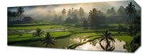 Obraz z serii pejzaże zatytułowany Świt nad Tarasami. Ta zachwycająca scena przedstawia malownicze tarasy ryżowe, kąpane w ciepłym świetle wschodzącego słońca. Mgła delikatnie opada na zielone pola, a w tle majaczą zarysy gór, dodając głębi i tajemniczości krajobrazowi. Palmy i tradycyjne chaty dopełniają obrazu, tworząc wizję spokoju i harmonii z naturą. Obraz emanuje spokojem i jest hołdem dla prostoty wiejskiego życia. Idealnie wkomponuje się w przestrzenie, gdzie chcemy wprowadzić element uspokajający i zainspirowany naturą, jak medytacyjne spa, poczekalnie w klinikach wellness czy prywatne biblioteki.