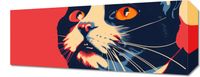 Obraz z serii abstrakcja zatytułowany Szok. Obraz przedstawia zbliżenie na twarz kota w stylizowanej, graficznej formie. Przeważającym kolorem jest intensywny czerwony, który stanowi tło dla sylwetki kota. Wyraziste, żółte oczy zwierzęcia przyciągają uwagę, a ich niemal hipnotyzujący wzrok jest skierowany ku widzowi. Wizerunek kota jest zróżnicowany kolorystycznie: od ciemnych odcieni, poprzez szarości, aż po żywe akcenty błękitu i pomarańczy, które dodają dynamiki i głębi. Detale takie jak wąsy i futro są wyraźnie zaznaczone białymi i niebieskimi liniami, co nadaje ilustracji ruch i teksturę. Całość kompozycji ma współczesny, prawie popartowy charakter, przyciągając wzrok i wzbudzając emocje. Jest to dzieło, które mogłoby znaleźć miejsce w nowoczesnych przestrzeniach, podkreślając miłość do zwierząt i sztuki.