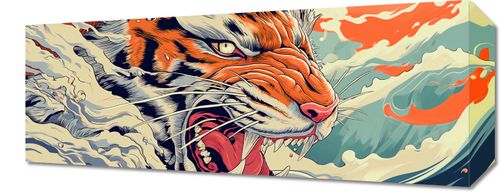 Obraz z serii motywy wschodnie zatytułowany Tygrys Na Fali. Ilustracja przedstawia potężnego tygrysa wyłaniającego się z wzburzonych fal oceanu, z paszczą szeroko otwartą w głośnym ryku. Styl graficzny, z wyrazistymi liniami i żywymi kolorami, przypomina klasyczne azjatyckie sztuki, łącząc w sobie elementy tradycji i nowoczesności. Dynamiczne pociągnięcia pędzlem i kontrastowe kolory podkreślają siłę i dzikość sceny. Obraz ten będzie idealnym akcentem w przestrzeniach, które celebrują energię i życiową siłę, takich jak sale do ćwiczeń, studia artystyczne czy nowoczesne biura.