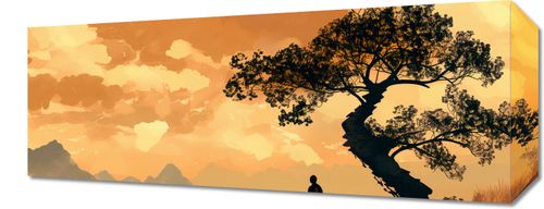 Obraz z serii motywy wschodnie zatytułowany Zen. Obraz przedstawia malowniczy krajobraz w ciepłych odcieniach pomarańczy i brązu, sugerujący scenerię o zachodzie słońca. Centralny punkt obrazu to sylwetka krętego drzewa z gęstym, czarnym liśćmi, wyróżniającego się na tle zachmurzonego nieba. U jego podnóża stoi samotna postać ludzka, która wydaje się rozważać lub podziwiać otaczający ją pejzaż. W oddali majaczą zarysy górskie, co dodaje głębi i tajemniczości kompozycji. Całość tworzy atmosferę spokoju, refleksji i połączenia z naturą. Świetnie sprawdzi się w pomieszczeniach o tematyce orientalnej jak i salonach psychologicznych.