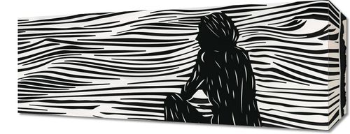 Obraz z serii abstrakcja zatytułowany Złożone Fluidalne Linie. Plakat przedstawia abstrakcyjną, czarno-białą ilustrację, w której kontrastowe, fluidalne linie tworzą efekt wzburzonej powierzchni wody. Na tej dynamicznie zarysowanej powierzchni wyłania się sylwetka osoby, która siedzi w skupieniu, z głową zwróconą w stronę obserwatora. Postać jest zredukowana do ciemnych, monochromatycznych bloków, co nadaje jej minimalistyczny, ale wyrazisty charakter. Sylwetka człowieka jest wyraźnie zarysowana i stanowi centralny punkt kompozycji, a jej kontury płynnie wtapiają się w abstrakcyjne tło. Ten artystyczny obraz łączy prostotę z głębią, sugerując kontemplację lub introspekcję. Jego prosta paleta barw i silne linie mogą przyciągać uwagę i inspirować do refleksji nad spokojem i złożonością ludzkiej natury.