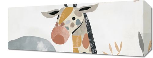 Obraz z serii wnętrza zatytułowany zatytułowany Żyrafa Bambino przedstawia stylizowany wizerunek żyrafy, którego cechy zostały zredukowane do prostych, geometrycznych kształtów i bloków pastelowych barw. Delikatne tekstury i ciepłe odcienie tworzą harmonijną kompozycję, która przyciąga wzrok i wprowadza do wnętrza spokój. Tło jest minimalistyczne z akcentami abstrakcyjnych form, co dodatkowo podkreśla nowoczesny charakter dzieła. Ten obraz będzie idealnym dodatkiem do przestrzeni o współczesnym designie, takich jak nowoczesne biura, kreatywne przestrzenie pracy, a także do pokojów dziecięcych lub wszędzie tam, gdzie chcemy dodać odrobinę zabawy i elegancji.