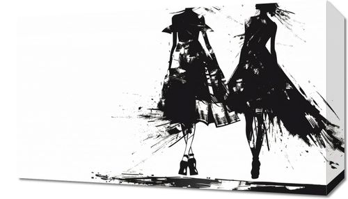 Obraz z serii wnętrza zatytułowany Atramentowy Przerys. Plakat ukazuje dwie stylizowane postacie kobiet w dynamicznej pozie, co nadaje wrażenie ruchu i elegancji. Obraz jest utrzymany w monochromatycznej palety kolorystycznej, gdzie silne kontrasty czerni i bieli tworzą dramatyczny efekt. Postaci są zredukowane do esencjonalnych form i plam atramentu, co przypomina szkice mody z charakterystycznym dla tego gatunku użyciem cienia i światła do zarysowania konturów odzieży i ciała. Energetyczne smugi i plamy atramentu sprawiają, że suknie wydają się falować i poruszać, a zarysowane w sposób abstrakcyjny obcasy dodają całej kompozycji współczesnego wyrazu. Ten obraz mógłby być wspaniałym dodatkiem do przestrzeni o nowoczesnym, artystycznym charakterze, takich jak atelier, modowe salony czy współczesne galerie.