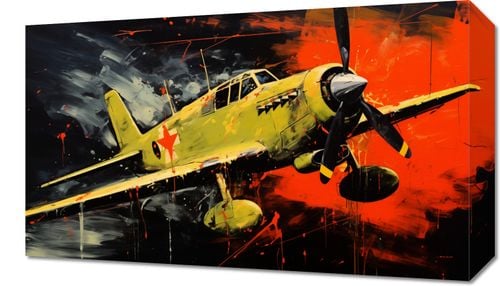 Obraz z serii abstrakcja zatytułowany Barwny Przelot. Obraz prezentuje dynamiczną scenę z klasycznym samolotem wojskowym na tle dramatycznego, ekspresyjnego nieba. Maszyna jest wyraźnie zaznaczona, z widocznymi detalami konstrukcyjnymi i oznaczeniami gwiazd, które sugerują przynależność do sił powietrznych. Tło obrazu jest pełne energii, z intensywnymi pociągnięciami pędzla i abstrakcyjnymi plamami farby w odcieniach czerwieni, czerni i bieli, co nadaje scenie uczucie ruchu i chaosu bitwy. Styl ten może odzwierciedlać dynamiczną naturę lotniczego manewru lub intensywność doświadczeń bojowych. Obraz ten mógłby stanowić mocny akcent w każdym wnętrzu, zwłaszcza tam, gdzie chce się oddać hołd historii lotnictwa lub militarnej odwadze.