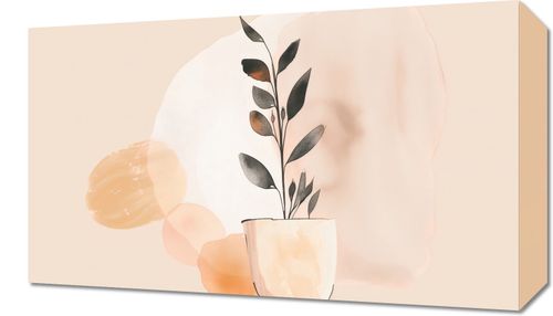 Obraz z serii wnętrza zatytułowany Doniczkowy Kolor. Obraz przedstawia minimalistyczną i stylową kompozycję roślinną na delikatnym, pastelowym tle. Centralnym punktem jest elegancka, czarno-brązowa gałązka z liśćmi w stonowanej kolorystyce, umieszczona w jasnym, beżowym doniczce o subtelnych odcieniach i delikatnym cieniowaniu. Tło składa się z miękkich, organicznych plam w odcieniach kremu, beżu i ciepłego brązowego, które tworzą efekt akwarelowy. Całość jest utrzymana w spokojnej, relaksującej palecie barw, co sprawia, że obraz ten idealnie nadaje się do przestrzeni, gdzie chcemy wprowadzić element spokoju i harmonii, jak salon czy sypialnia. Delikatność i prostota wzoru podkreślają nowoczesny charakter tego dzieła, jednocześnie zachowując ponadczasową elegancję.