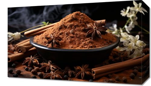 Obraz z serii święta zatytułowany Esencja Aromatu. Mocny akcent na kompozycję przypraw z cynamonem, anyżem i ziarnami pieprzu rozsypanych wokół miski pełnej mielonego cynamonu, tworzący wzór przypominający sztukę natury, wyróżnia się zarówno prostotą, jak i głębią. Delikatny dym unoszący się nad przyprawami dodaje atmosfery ciepła i domowego ogniska. Ten obraz idealnie komponuje się z kuchniami o bogatym, ziemskim wystroju, jak również z eleganckimi restauracjami oferującymi etniczną kuchnię, gdzie podkreśli uczucie przytulności i tradycji.