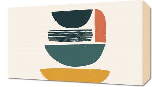 Obraz z serii boho zatytułowany Fale Wodne.Obraz prezentuje minimalistyczne podejście do natury za pomocą abstrakcyjnych, geometrycznych form. Półkoliste i prostokątne kształty w ziemistych tonacjach zieleni, niebieskiego i musztardowego żółcia układają się w spójną kompozycję. Tekstura przypominająca drewno lub fale wodne dodaje głębi centralnie umieszczonemu elementowi, stanowiąc serce i ognisko obrazu. Dzieło to idealnie pasuje do wnętrz, które cenią sobie spokój, równowagę i naturalne motywy, oferując jednocześnie nowoczesny wygląd. Będzie wyjątkowym akcentem w salonach, przestrzeniach biurowych, a nawet jako element uzupełniający w minimalistycznych sypialniach. Obraz może służyć jako wizualny element łączący różne części dekoracji wnętrza.