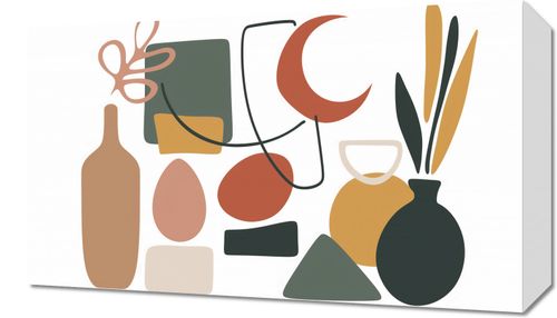 Obraz z serii minimalistyczne zatytułowany Formy Wyzwolone. Grafika składa się z zestawu prostej, ale wyrafinowanej kolekcji kształtów i form w przyjemnej, stonowanej palecie kolorów, z akcentami w odcieniach pomarańczu, zieleni, beżu i czerni. Elementy takie jak butelki, wazony i rośliny są przedstawione w sposób uproszczony, lecz stylowy, z nutą abstrakcyjnego charakteru. Obraz ten świetnie wkomponuje się w nowoczesne i artystyczne przestrzenie, takie jak designerskie biura, minimalistyczne salony, a nawet awangardowe galerie. Z jego pomocą można łatwo wprowadzić graficzną równowagę do wnętrza, zachowując przy tym lekkość i nowoczesność estetyki. Idealnie pasuje do miejsc, gdzie chce się podkreślić indywidualizm i miłość do sztuki.