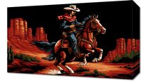 Obraz z serii pop art zatytułowany Galop przez Prerię. Dynamiczna ilustracja przedstawia kowboja w tradycyjnym stroju, galopującego na wiernym rumaku przez pustynny krajobraz. Żywe kolory i detaliczne wykonanie postaci oraz konia, a także skaliste formacje i kaktusy w tle, nadają scenie autentycznego ducha zachodniej przygody. Stylizacja graficzna łączy elementy klasycznych westernów z nowoczesną estetyką komiksu, co sprawia, że obraz ten idealnie wpisuje się w dekoracje wnętrz inspirowane amerykańskim folklorem lub jako ozdoba domowego kina dla miłośników filmów o tematyce kowbojskiej.
