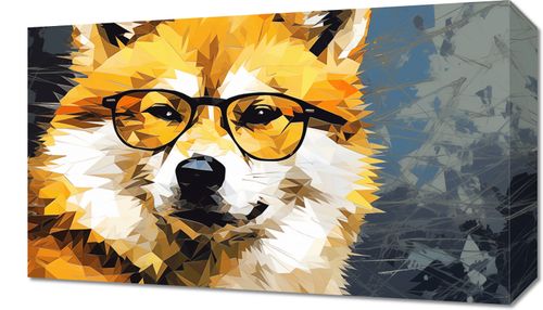 Obraz z serii pop art zatytułowany Intelektualny Psiak - wyrafinowany portret psa wykonany w stylu low poly, który jest artystycznym połączeniem nowoczesnej grafiki i dzikiego ducha natury. Pomarańczowe, białe i czarne wielokąty tworzą wizerunek psa z charakterystycznymi okularami, nadając mu wygląd pełen inteligencji i wyrafinowania. Mroczne tło z abstrakcyjnymi elementami dodaje głębi i kontrastu, wyróżniając głównego bohatera. Ten obraz to idealne odzwierciedlenie połączenia natury z kulturą miejską, świetnie nadające się do dekoracji nowoczesnych przestrzeni takich jak kawiarnie, księgarnie, czy domowe biura osób ceniących unikalny design i przyrodnicze motywy.