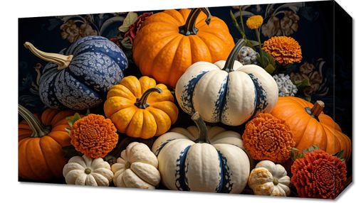 Obraz z serii natura zatytułowany Jesienne Bogactwo. Ta kompozycja to celebracja urodzaju jesieni, ukazująca bogactwo i różnorodność dyń w pełnej krasie. Kontrastujące faktury i kolory od kremowej bieli do głębokiej pomarańczy są uzupełnione o ciepłe odcienie złotych kwiatów, tworząc obraz, który emanuje ciepłem i domową atmosferą. Idealny do dekoracji kuchni lub jadalni, gdzie może inspirować do sezonowych przetworów i przygotowań świątecznych potraw. Ten obraz będzie również doskonałym dodatkiem do przestrzeni takich jak sklepy z dekoracjami domowymi, kawiarnie lub restauracje, które chcą wprowadzić atmosferę przytulności i naturalnego piękna.
