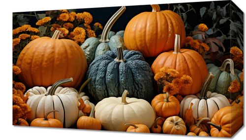 Obraz z serii natura zatytułowany Jesienne Urodzaje przedstawia bujne bogactwo jesieni. Centralne miejsce zajmuje soczysta, pomarańczowa dynia, królowa jesieni, otoczona przez różnorodność jej barwnych odmian. Niebieskawe i białe dynie tworzą wyjątkowy kontrast, a wszystko to uzupełnione jest przez złociste i burgundowe chryzantemy, które dodają kompozycji ciepła i głębi. Całość osadzona jest na tle w klasycznych, ciemnych odcieniach, co podkreśla elegancję i dojrzałość sezonu. Obraz ten idealnie wpasuje się w przestrzeń kuchni lub jadalni, dodając jej charakteru oraz ciepłego, domowego klimatu. Doskonale odnajdzie się także w przestrzeniach takich jak winiarnie czy restauracje serwujące sezonowe dania, gdzie podkreśli bogactwo i obfitość jesiennej palety smaków.