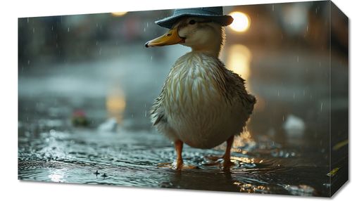 Obraz z serii wnętrza zatytułowany Kaczka w Kapeluszu. Przedstawia on kaczkę, która z zadziorną nonszalancją stoi pod deszczem, ubrana w stylowy, niebieski kapelusz, co nadaje jej ludzki charakter. Scena uchwycona jest w złotym świetle, z mglistym tłem miejskiego krajobrazu, które dodaje głębi i atmosfery. Kaczka, z kroplami wody spływającymi po jej piórach, wygląda na zadowoloną, jakby cieszyła się każdą chwilą. Ten obraz, dzięki swojej ciepłej kolorystyce i lekko humorystycznemu podejściu, idealnie nadaje się do wnętrz, które cenią sobie oryginalność i dobrą energię. Świetnie sprawdzi się w przestrzeniach pełnych życia, takich jak kawiarnie, przestrzenie kreatywne, a także jako uroczy akcent w domowych salonach czy pokojach dziecięcych.
