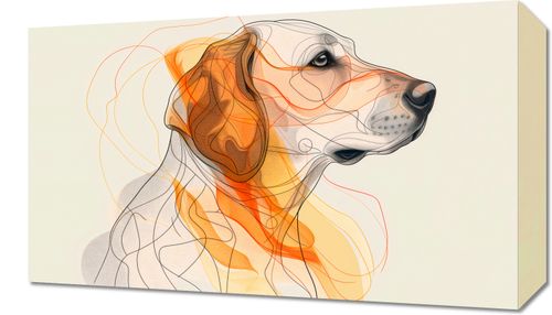 Obraz z serii abstrakcja zatytułowany Kontur Profilowego. Obraz przedstawia portret psa w stylu artystycznym, z subtelnie zaznaczonymi, ale wyraźnymi cechami. Kompozycja łączy realistyczne detale takie jak oczy, nos i uszy z abstrakcyjnymi, płynnymi liniami i plamami kolorów, które tworzą wrażenie ruchu i głębi. Dominujące kolory to odcienie pomarańczowego, żółtego i brązu, które idealnie oddają ciepło i przyjazny charakter zwierzęcia. Tło w neutralnym, pastelowym odcieniu podkreśla i równoważy bardziej dynamiczne elementy grafiki. Obraz emanuje spokojem i może wzbudzać pozytywne emocje, będąc jednocześnie wyrafinowanym, artystycznym przedstawieniem psa, który może być ulubieńcem rodziny lub po prostu przykuwającym uwagę elementem dekoracyjnym.