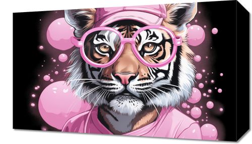 Obraz z serii pop art Ludzki Tygrys. Na obrazie widzimy głowę tygrysa, który jest ubrany w stylizowany, ludzki sposób. Tygrys ma na sobie różową czapkę z daszkiem oraz okulary w tym samym kolorze, co dodaje mu ludzkiego charakteru. Tło obrazu jest proste, pokryte bąbelkami w różnych odcieniach różu, co tworzy zabawny i lekko surrealistyczny klimat. Ten kolorowy i kreatywny projekt może przyciągnąć uwagę w różnorodnych przestrzeniach, od młodzieżowych pokoi po galerie sztuki. Jest to doskonały przykład współczesnego połączenia natury i kultury pop, który może być tematem rozmów i oryginalnym elementem dekoracyjnym.