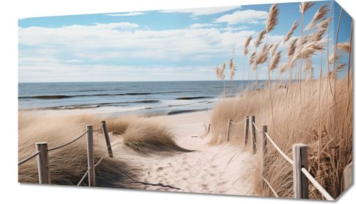 Obraz z serii pejzaże zatytułowany Nadmorski Most to tytuł tej zapierającej dech w piersiach ilustracji, która przemawia do duszy miłośnika morza. Delikatne trawy morskie tańczą w rytmie przybrzeżnego wiatru, a spokojne fale delikatnie docierają do złocistego piasku, tworząc melodię naturalnego spokoju. Nieskazitelnie błękitne niebo przechodzące w pastelowe odcienie na horyzoncie dodaje głębi i przestrzeni, tworząc obraz idealny do umieszczenia w przestrzeniach, które celebrują ciszę i kontemplację. Ten obraz będzie wyjątkowym dodatkiem do każdej plażowej chaty, salonu nadmorskiego domu, a nawet biura, przypominając o nieskończonej przestrzeni i wolności, jaką oferuje morze.