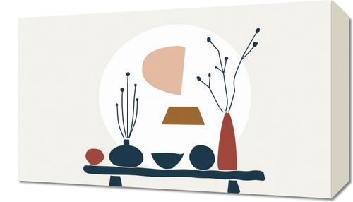 Obraz z serii boho zatytułowany Naturański Stół. Obraz to subtelna i uporządkowana prezentacja natury w stylizowanej, niemal scenicznej formie. Abstrakcyjne kształty w ciepłych i stonowanych kolorach przedstawiają wazony i rośliny na tle geometrycznych form przypominających wschód i zachód słońca. Kompozycja na neutralnym tle łączy sztukę z naturą w spójnym, współczesnym stylu. Dzieło to będzie idealnym uzupełnieniem wnętrz, w których ceniona jest prostota, ale jednocześnie szukających ciepła i naturalności. Może znaleźć miejsce w domowych salonach, jadalniach, lub jako urokliwy element w przestrzeniach biurowych, wniosąc odrobinę uroku i artystycznego nastroju.