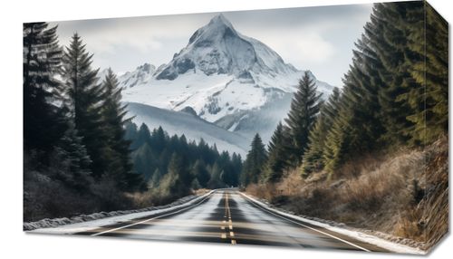 Obraz z serii pejzaże zatytułowany Odważna Podróż, przedstawia majestatyczną górę wyłaniającą się z pośród ciemnozielonych drzew iglastych, które wyznaczają drogę prowadzącą w kierunku jej śnieżnego szczytu. Siła i niezachwiana postawa góry w połączeniu z miękkimi konturami puchowych chmur nad nią tworzą doskonałą równowagę między wytrwałością a delikatnością. Czarna, wilgotna nawierzchnia drogi, rozświetlona światłem odbijającym się od jej wilgotnej powierzchni, prowadzi wzrok obserwatora wprost do serca dzikiej przyrody. Kontrast między ciemnymi drzewami a bielą śniegu dodaje dziełu głębi i tajemniczości. Ten obraz będzie idealnym dodatkiem do wnętrz o tematyce przygodowej i eksploracyjnej, jak również doskonałym wyborem dla przestrzeni biurowych firm turystycznych lub agencji podróżniczych, gdzie może inspirować i przypominać o majestacie i pięknie niezbadanych zakątków świata.