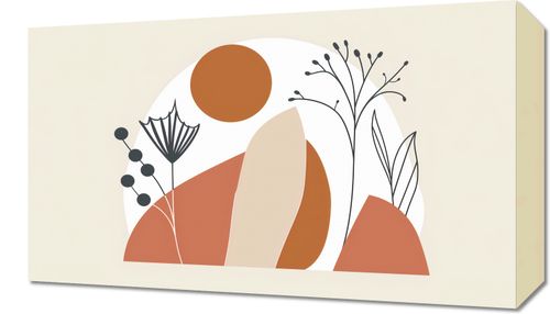 Obraz z serii boho zatytułowany Organiczny Splot. Obraz składa się z serii organicznie ułożonych form i linii, które wspólnie tworzą abstrakcyjną interpretację pejzażu przyrodniczego. Centralnym elementem jest duże, okrągłe słońce w ciepłym, rustykalnym odcieniu pomarańczu, które rozświetla scenę. Pod nim rozmieszczone są wzory roślinne o delikatnych konturach i bardziej intensywnej czerni, które wyłaniają się z zaokrąglonych wzgórz w odcieniach brązu i beżu. Te botaniczne elementy nadają kompozycji dynamiki, tworząc przy tym wrażenie głębi i struktury. Obraz wydaje się oddawać spokój i urok naturalnego krajobrazu, idealnie nadając się do przestrzeni, które pragną przywołać odrobinę natury wewnątrz, takich jak minimalistyczne salony, spokojne przestrzenie biurowe, czy przytulne zakątki domowego zacisza.