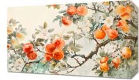 Obraz z serii abstrakcja zatytułowany Persymony. Przedstawia delikatną i kolorową ilustrację gałęzi owocowych w stylu azjatyckiej akwareli. Na obrazie widzimy rozkwitające kwiaty oraz dojrzałe, soczyste owoce persymony których intensywna pomarańczowa barwa jest pięknie wyeksponowana na tle pastelowych kolorów. Liście i gałęzie są przedstawione z subtelnymi niuansami zieleni i brązów, co dodaje głębi i naturalnego charakteru scenie. Ta sztuka łączy w sobie tradycyjne motywy i techniki malarskie z nowoczesnym podejściem do koloru i kompozycji, co czyni ją zarówno klasyczną, jak i współczesną. Obraz ten idealnie nadawałby się do przestrzeni, które cenią spokój i harmonię, takich jak salony relaksacyjne, gabinety spa, czy jako wyrafinowany akcent w domowej jadalni.
