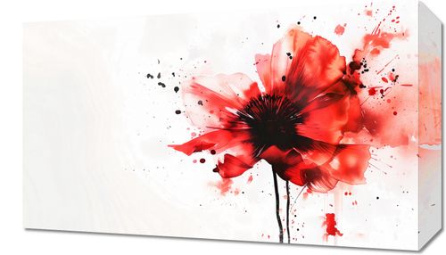 Obraz z serii abstrakcja zatytułowany Płynna Akwarela. Na obrazie przedstawiony jest kwiat w stylu akwarelowym, z dominującą czerwoną paletą barw, która przechodzi w mocne akcenty czerni w centrum kwiatu. Obraz ma dynamiczny i spontaniczny charakter, co podkreślają rozbryzgi i krople farby rozchodzące się wokół kwiatu. Przypomina to efekt plamy, który dodaje kompozycji artystycznego wyrazu i energii. Kontrast między delikatnymi czerwieniami a głęboką czerń centrum kwiatu przyciąga wzrok i czyni obraz bardzo wyrazistym. Tło jest jasne z subtelnie zaznaczonymi plamami, co dodatkowo akcentuje dramatyzm i piękno przedstawionego kwiatu.