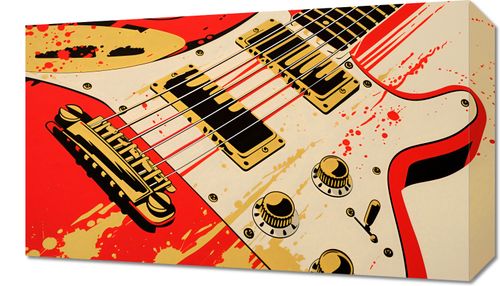 Obraz z serii abstrakcja zatytułowany Przed Graniem. Przedstawia zbliżenie na czerwoną gitarę elektryczną, której design jest wyrazisty i pełen energii. Widać detale instrumentu, takie jak przetworniki, potencjometry i struny, które są wyraźnie zaznaczone kontrastującymi kolorami złota, czerni i bieli na tle intensywnej czerwieni. Rozpryski i plamy farby na korpusie gitary nadają plakatowi surowy, rockowy charakter, co może sugerować żywiołowość i pasję muzyki granej na tym instrumencie. Ten obraz mógłby być atrakcyjnym elementem dekoracyjnym w przestrzeniach dedykowanych muzyce, takich jak sale prób, studia nagraniowe, pokoje młodzieżowe lub jako odważny akcent w nowoczesnym salonie.