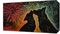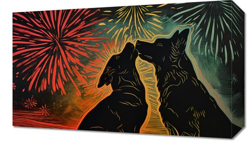 Obraz z serii abstrakcja zatytułowany Psi Uścisk. Przedstawia on dwie sylwetki psów, które wydają się być zwrócone ku sobie w gest podobny do uścisku, na tle intensywnie kolorowego nieba z fajerwerkami. Barwy od czerwieni po żółcie i zielenie tworzą tło, które wygląda jak nocne niebo w trakcie świętowania. Styl graficzny jest dynamiczny i pełen energii, a linie tworzące sylwetki psów są płynne i wyraziste. Ten obraz wyraża radość i nieodłączną więź pomiędzy zwierzętami, będąc doskonałym dodatkiem do wnętrz, gdzie chcemy podkreślić ciepło i pozytywne emocje.