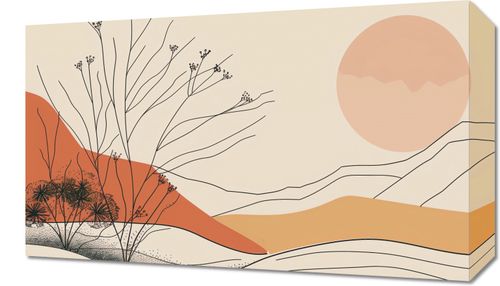 Obraz z serii boho zatytułowany Pustynna Wydma. Obraz ukazuje krajobraz z delikatnie zarysowanymi roślinami na tle łagodnych, pustynnych wydm. Spokojna kolorystyka, opierająca się na miękkich odcieniach beżu, pomarańczy i czerwieni, oddaje kojący klimat zmierzchu. W tle widoczne jest wielkie, ciepłe słońce, które rzuca złoty blask na całą scenę, nadając jej harmonijny charakter. Ten obraz będzie piękną dekoracją do wnętrz, które pragną wprowadzić elementy natury w połączeniu z minimalistycznym designem. Jego uspokajające barwy i proste linie idealnie wpasują się w przestrzenie takie jak sypialnie, salony, miejsca odpoczynku, czy nawet biura kreatywne, pragnące wykreować przestrzeń sprzyjającą relaksowi i inspiracji.