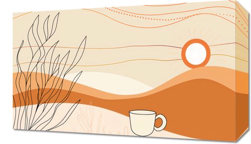 Obraz z serii minimalistyczne zatytułowany Ranna Pora. Obraz przedstawia stylizowany, spokojny krajobraz pustynny z wschodzącym słońcem, które emanuje ciepłem, barwiąc niebo w pastelowe odcienie. Ponad łagodnymi, falującymi wzgórzami widnieją delikatne linie, które mogą przypominać ciepłe prądy powietrza lub subtelne ozdoby. Na pierwszym planie znajduje się filiżanka kawy, umieszczona tak, jakby była częścią pustynnego terenu, co dodaje scenie element codziennego rytuału i spokoju. Obraz jest pełen ciepłych, ziemiście beżowych i pomarańczowych odcieni, które wprowadzają atmosferę relaksu i spokoju. Idealnie pasuje do przestrzeni wypoczynkowych, takich jak kawiarnie, salony, czy pokoje do odpoczynku, gdzie może pomóc stworzyć przytulne i spokojne otoczenie. Dzieło to z pewnością będzie przyciągać wzrok, będąc subtelny jednocześnie.