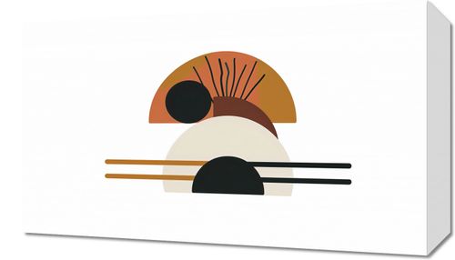 Obraz z serii boho zatytułowany Słońce i Cień. Obraz przedstawia zestawienie półkoli i geometrycznych kształtów, które razem tworzą interpretację astronomicznego zjawiska. Na górze mamy półkoło w ciepłych odcieniach pomarańczu z czarnym dyskiem, które przywodzi na myśl słońce częściowo zakryte przez księżyc podczas zaćmienia. W centrum dominuje większe półkoło w kolorze kości słoniowej, stanowiące tło dla pozostałych elementów. Przez środek obrazu przebiegają równoległe linie, które mogą symbolizować równonoc lub zmianę pór roku. Całość kompozycji wydaje się balansować na granicy światła i cienia, tworząc estetycznie przyciągający i spokojny obraz. Doskonale odnajdzie się na ścianach w nowoczesnych przestrzeniach życiowych, biurach z konceptem open space, a także jako ozdoba w holach i poczekalniach, gdzie geometryczne formy mogą stać się punktem skupienia i medytacji.