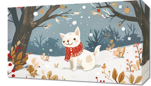 Obraz z serii wnętrza zatytułowany Śnieżny Kompan. Urocze przedstawienie białego, puchatego psa w czerwonym szaliku, który przywołuje ciepłe uczucia w chłodnym, zimowym otoczeniu. Zwierzę z radosnym wyrazem twarzy wydaje się cieszyć spadającymi płatkami śniegu, co dodaje obrazowi poczucia radości i bezpretensjonalnej zabawy. Tło w pastelowych odcieniach bieli i szarości z delikatnymi akcentami kolorystycznymi tworzy spokojną i relaksującą atmosferę. Obraz idealnie nadaje się do dekoracji pomieszczeń dziecięcych, salonów, czy przytulnych kawiarni, wprowadzając do wnętrza element zabawy i niewinności. Jego ciepłe barwy i sympatyczny motyw sprawią, że będzie doskonałym dodatkiem do miejsc, w których chcemy poczuć odrobinę zimowego ciepła i uroku.
