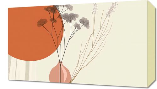 Obraz z serii boho zatytułowany Suszony Widok. Obraz ukazuje zgeometryzowane, stylizowane kwiaty suszonych roślin w wazonie na tle dużego, okrągłego słońca w ciepłych odcieniach pomarańczy i beżu. Kompozycja, w której dominują spokojne, jesiennie nastroje, łączy prostotę formy z bogactwem faktury. Obraz ten doskonale odnajdzie się w wnętrzach o prostym, lecz eleganckim wystroju, takich jak minimalistyczne salony, jadalnie czy hol. Idealnie wpasuje się w otoczenie zarówno nowoczesne, jak i te z nutą retro, wprowadzając ciepło i artystyczną, subtelność.