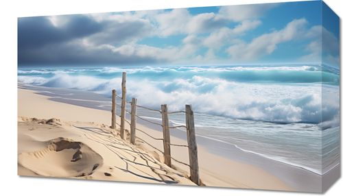 Obraz z serii pejzaże zatytułowany Szepty Oceanu przedstawia dziką, nieokiełznaną siłę natury, uchwyconą w potężnych, spienionych falach oceanu bijących o brzeg. Stare, drewniane słupki, połączone powykręcanym sznurem, dodają kompozycji surowego charakteru i poczucia trwałości w obliczu nieskończonej przestrzeni wody. Piasek, modelowany przez wiatr, tworzy delikatne wzory, które kontrastują z mocy i wielkości oceanu. Ten obraz jest kwintesencją siły i spokoju, idealny do przestrzeni współczesnych, minimalistycznych lub tych o morskim motywie, gdzie może inspirować do refleksji nad nieustającą zmiennością i majestatem natury.