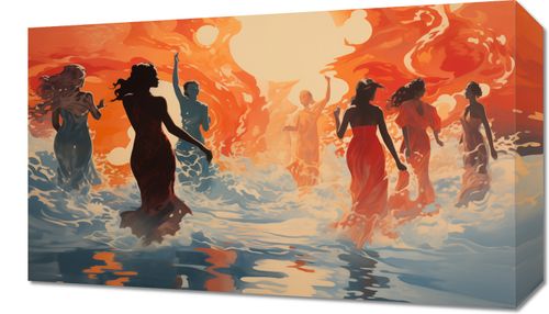 Obraz z serii wnętrza zatytułowany Taneczny Żar, przedstawia grupę osób tańczących w rytmicznych ruchach w wodzie, z tłem zapalającego się nieba w odcieniach ciepłego pomarańczu i czerwieni. Postacie są przedstawione w dynamicznych pozach, z włosami rozwianymi przez wiatr, co nadaje obrazowi wrażenie ruchu i pasji. Styl obrazu, z jego płynnymi liniami i żywymi kolorami, tworzy uczucie energii i życia. Ten obraz idealnie nadaje się do wnętrz, które chcą uchwycić esencję ruchu, radości i wolności, takich jak studia taneczne, kreatywne przestrzenie pracy, a także jako inspirujący element w domach, gdzie może stanowić przypomnienie o pięknie wspólnych chwil i celebracji życia.