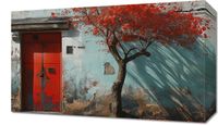 Obraz z serii wnętrza zatytułowany Widok Na Dawne. Kompozycja łączy surowość starych, połatanych ścian w stonowanych kolorach z wyrazistym czerwonym drzwiami oraz rozkwitłym drzewem o żywym karmazynowym kolorze, które zdaje się wprowadzać życie i energię do miejskiej monotonii. Promienie światła przenikające przez liście dodają głębi i tajemniczości scenie. Ten obraz doskonale wkomponuje się w przestrzenie kreatywne, galerie sztuki lub jako akcent w minimalistycznych, nowoczesnych wnętrzach, przynosząc z sobą odrobinę miejskiego romansu i poezji codzienności.