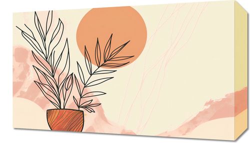 Obraz z serii minimalistyczne zatytułowany Widok nad Pustynią. Obraz przedstawia prostą, lecz wyrazistą kompozycję rośliny w glinianym doniczce na tle stylizowanego, pastelowego krajobrazu pustynnego. Wzgórza pustyni w odcieniach beżu i pomarańczu tworzą miękkie, falujące linie, nad którymi wznosi się duży, okrągły dysk słońca o intensywnej, ciepłej barwie. Delikatne linie, które wydają się emanować od słońca, przypominają ciepłe wiatry pustyni lub subtelne promienie słoneczne. Obraz ten wydaje się być idealny do ożywienia i dodania ciepła każdej przestrzeni, szczególnie tych, które są utrzymane w jasnej i neutralnej kolorystyce. Jego delikatna paleta i klarowność form mogą wprowadzić atmosferę spokoju i równowagi do salonów, jadalni czy nawet nowoczesnych przestrzeni biurowych.