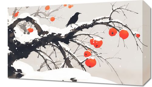 Obraz z serii motywy wschodnie zatytułowany Wschodnia Akwarela przedstawia zimowy krajobraz w stylu wschodnim. Drzewo o ciemnych, wyrazistych gałęziach pokrytych śniegiem wygina się elegancko na tle spokojnego, jednolitego tła. Na gałęziach znajdują się czerwone owoce, które mogą być symbolem persymonów lub innych zimowych owoców, kontrastujących swoim żywym kolorem z zimowym otoczeniem. Na jednej z gałęzi spoczywa czarny ptak, być może kruk, co dodaje życia i głębi kompozycji. Spadające płatki śniegu i subtelne odcienie w tle nadają scenie uczucie spokoju i ciszy. Ten obraz łączy prostotę z elegancją, mogąc stanowić wyrafinowaną dekorację w przestrzeniach szukających spokojnej, lecz wyrazistej estetyki.