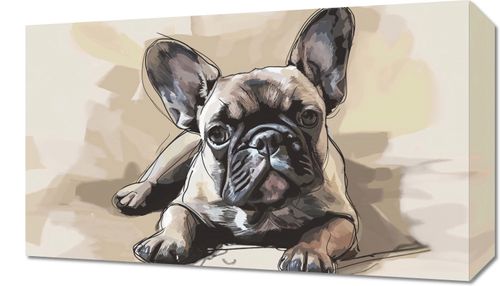 Obraz z serii wnętrza zatytułowany Zawsze Czeka, przedstawia realistycznie oddanego buldoga francuskiego w odcieniach beżu i brązu, z charakterystycznymi dużymi uszami i głębokim spojrzeniem. Pies leży na ciepło oświetlonym podłożu, a jego cień rozmywa się w tle. Użyta paleta kolorów nadaje obrazowi przytulny i domowy nastrój, podczas gdy szczegółowe tekstury sierści dodają głębi i realizmu. Ten obraz idealnie wpasuje się w wnętrza domowe, wnosząc element ciepła i towarzyskości. Może być doskonałym akcentem w salonie, gdzie domownicy i goście często gromadzą się na wspólne chwile, lub w przestrzeniach dedykowanych miłośnikom zwierząt.