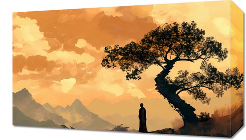 Obraz z serii motywy wschodnie zatytułowany Zen. Obraz przedstawia malowniczy krajobraz w ciepłych odcieniach pomarańczy i brązu, sugerujący scenerię o zachodzie słońca. Centralny punkt obrazu to sylwetka krętego drzewa z gęstym, czarnym liśćmi, wyróżniającego się na tle zachmurzonego nieba. U jego podnóża stoi samotna postać ludzka, która wydaje się rozważać lub podziwiać otaczający ją pejzaż. W oddali majaczą zarysy górskie, co dodaje głębi i tajemniczości kompozycji. Całość tworzy atmosferę spokoju, refleksji i połączenia z naturą. Świetnie sprawdzi się w pomieszczeniach o tematyce orientalnej jak i salonach psychologicznych.