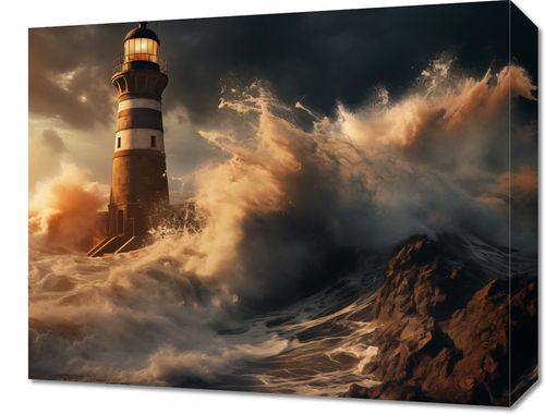 Obraz z serii pejzaże zatytułowany Bezlitosna Odyseja, ta ekspresyjna kompozycja uchwyca surową siłę natury, gdzie majestatyczna latarnia morska stoi nieugięta w obliczu rozszalałego morza. Wysokie, gwałtowne fale rozbijają się o skały, tworząc dramatyczny kontrast z ciepłym, złotym światłem zachodzącego słońca. Obraz emanuje dynamizmem i odwagą, a jednocześnie przekazuje spokój i bezpieczeństwo, jakie daje światło latarni w morskiej nawałnicy. Idealnie wpasuje się w przestrzenie, gdzie chcemy dodać nuty dramatyzmu i siły, takie jak nowoczesne biura czy przestronne salony, wnosząc atmosferę odwagi i wytrwałości.