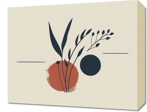 Obraz z serii boho zatytułowany Botaniczna Barwa. Grafika prezentuje stylizowany, graficzny bukiet natury, uchwycony w prostej, lecz wyrafinowanej kompozycji. Elementy roślinne w tonacji głębokiego granatu kontrastują z ciepłymi odcieniami terrakoty i spokojnym tłem, tworząc eleganckie połączenie barw i kształtów. Geometryczne formy i linie tworzą poczucie porządku i współczesnej estetyki. Ten obraz będzie się doskonale prezentował w nowoczesnych biurach, minimalistycznych salonach lub jako subtelny akcent w jasnych, przestronnych kuchniach. Doskonale odnajdzie się również w przestrzeniach komercyjnych, takich jak kawiarnie lub butiki, wprowadzając sztukę w codzienne otoczenie.