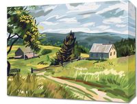 Obraz z serii pejzaże zatytułowany Bujna Wieś. Plakat przedstawia malowniczą scenę z wiejskiego krajobrazu, gdzie dominuje pastelowa paleta barw. W centralnym punkcie obrazu widzimy prostą, białą chłopską chatę z szarym dachem, otoczoną przez bujną, zieloną roślinność i rozległe pola. Drzewa z żółtymi akcentami wskazują na wczesną jesień, a ich rozmieszczenie i forma dają wrażenie naturalnego, rustykalnego otoczenia. Jasne, dynamiczne pociągnięcia pędzlem na niebie nadają scenie lekkości i ruchu, podczas gdy delikatnie zaznaczone wzgórza w tle oferują poczucie głębi i przestrzeni. Kolorystyka obrazu, łącząca ciepłe odcienie żółci z chłodnymi błękitami, przyciąga oko i sprawia, że scena jest zarówno spokojna, jak i energetyczna. Ta ilustracja może przywoływać uczucia nostalgii i spokoju, a także zachęcać do refleksji nad pięknem prostego życia na wsi.