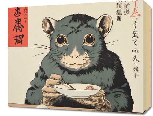Obraz z serii motywy wschodnie zatytułowany Chwila Refleksji. Intrygujące spojrzenie gryzonia w tradycyjnym stroju, podkreślane przez błękitną tunikę i precyzyjne detale, które nadają mu humanoidalnego charakteru. Czerwone naczynia oraz kanji w tle kontrastują z jasnymi barwami obrazu, dodając nuty głębi i dziedzictwa kulturowego. Subtelna gra światła i cienia na stoliku z jedzeniem i napojem wzbogaca kompozycję i zachęca do refleksji nad połączeniem tradycji z nowoczesnością. Świetnie sprawdzi się w kawiarniach o azjatyckim klimacie, galeriach sztuki oraz w przestrzeniach dedykowanych kulturze Wschodu.